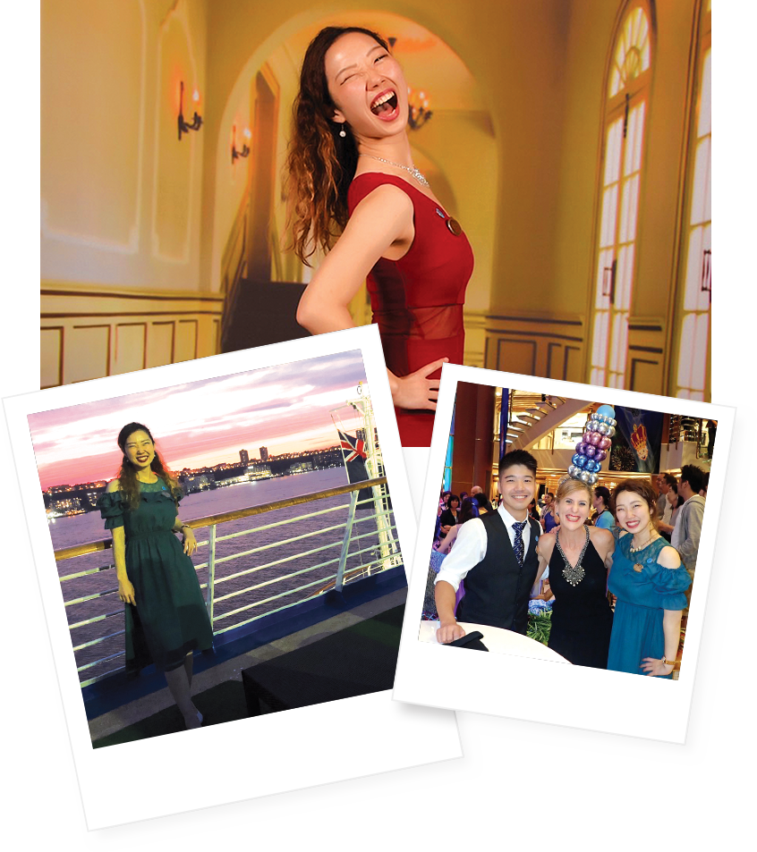 現在はプリンセス・クルーズでエンターテイナーとして、ゲームショーやパーティの司会、ダンスやクラフト教室のインストラクターなど、船内イベントの企画・運営・進行を担当しています。卒業後はアメリカにて米国三越CRプログラム(ウォルト・ディズニー・ワールド®リゾート内日本館)で働いた後、憧れていたプリンセス・クルーズに挑戦し、約5年間世界を旅しながら仕事をしてきました。2025年には大阪・関西万博フランス館で、世界中から訪れるVIP対応も経験しました。仕事のやりがいは、イベント後にお客様から直接いただく言葉です。特に海外のお客様は表現が豊かで、心から褒めてもらえる瞬間が大きな励みになります。クルーズ船での仕事は契約期間中に休みはありませんが、その分まとまった休暇があり、好きな国を旅できるのも魅力です。学生時代にイベントでダンスや演劇に挑戦した経験は、今の仕事に直結しています。英語に自信がなくても、努力を続ければ必ず道は開けます。私自身、トラジャルでの学びと留学をきっかけに夢を実現することができました。ぜひ自分の可能性を信じて、一歩踏み出してください。